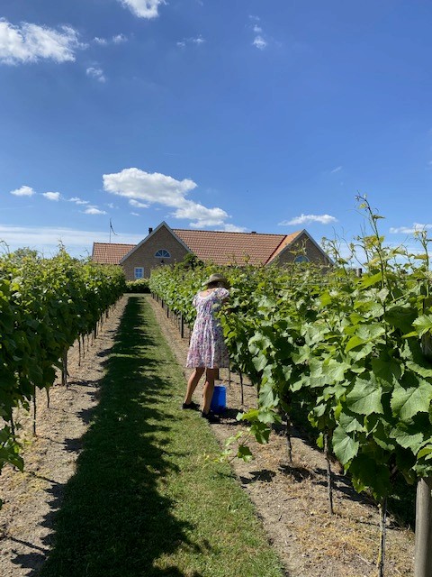 I slutet av juli och början av augusti avlövar vi runt klasarna för att skapa ventilation och att solens strålar kommer åt druvorna.