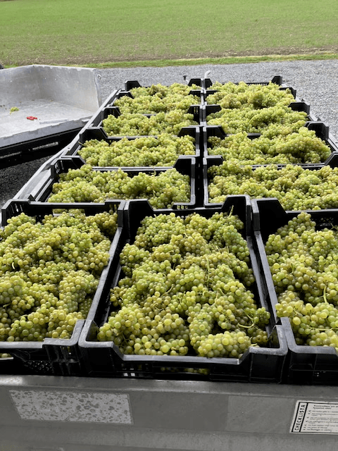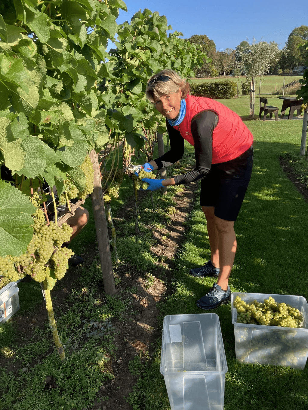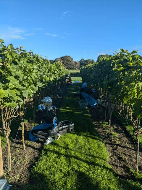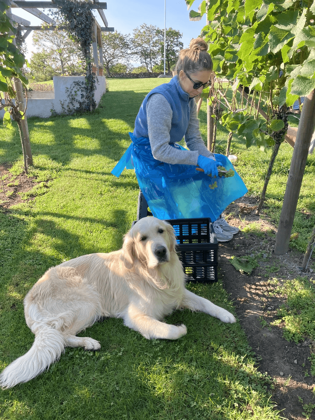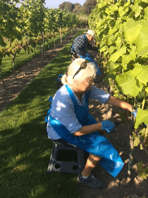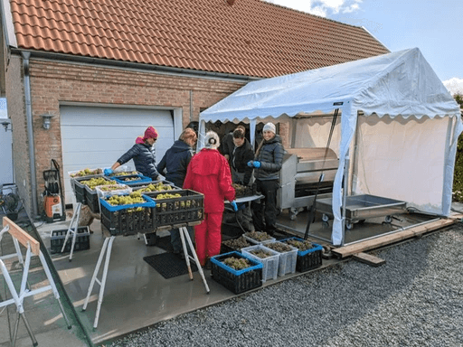 Vi handplockar, gallrar varsamt och pressar druvorna under två dagar. Släkt och vänner ansluter till skörden.