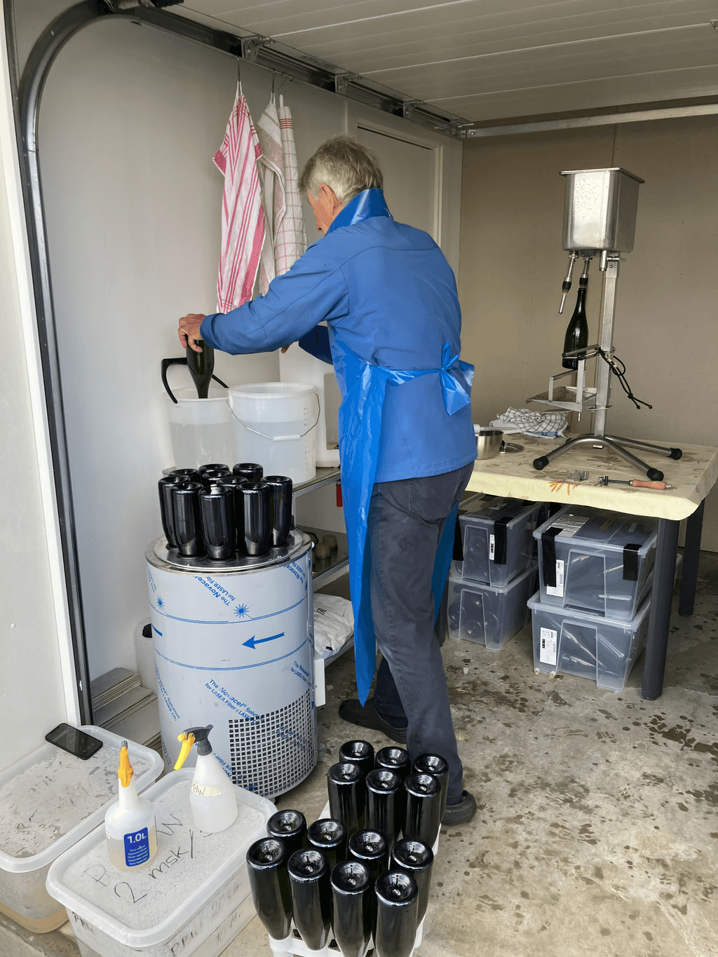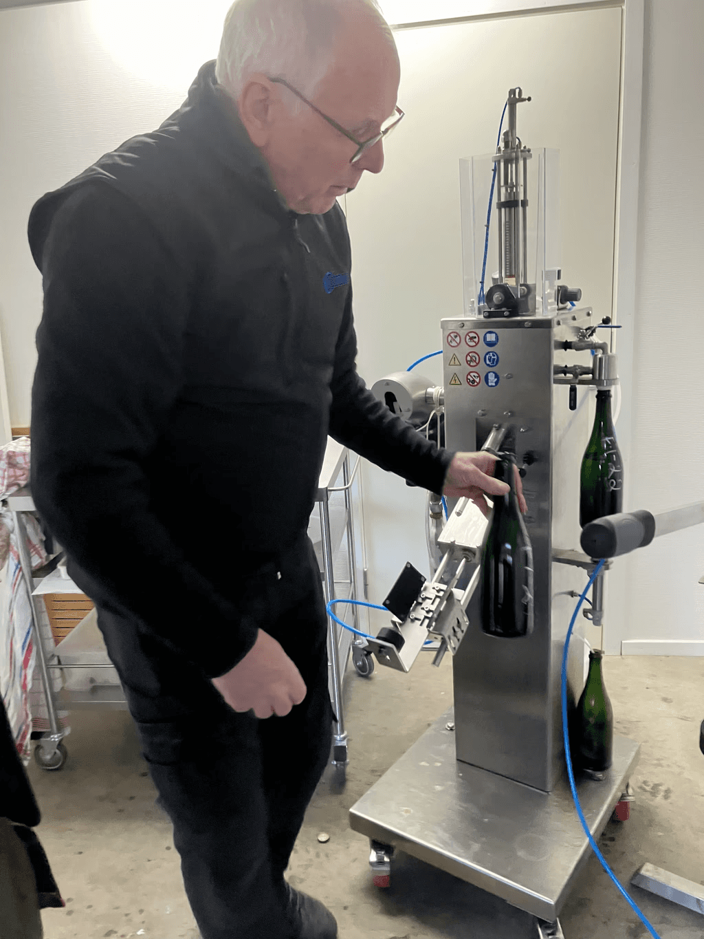 Perioden november till mars är även en lämplig tid för degorgering av de flaskor som legat minst tolv månader på flaskjäsning. Att göra mousserande vin innebär att man jäser vinet två gånger. Första jäsningen sker i tankar och andra jäsningen sker i butelj. Att degorgera innebär att vi ”skjuter” ut jästresterna ur flaskorna som legat på en andra jäsning i minst tolv månader. Under flaskjäsningen skapas ett högt tryck och ”bubblorna” bildas i vinet.