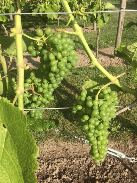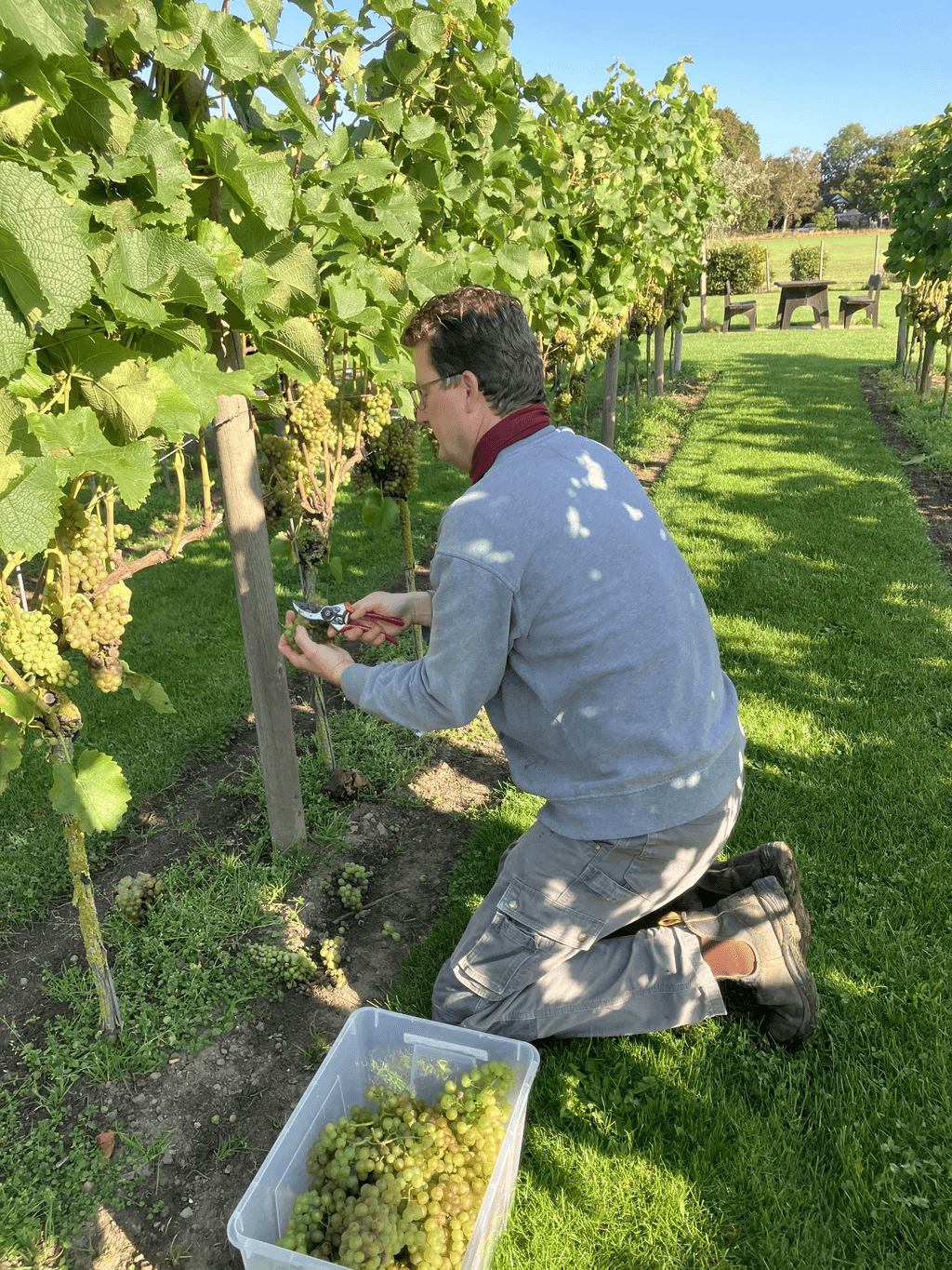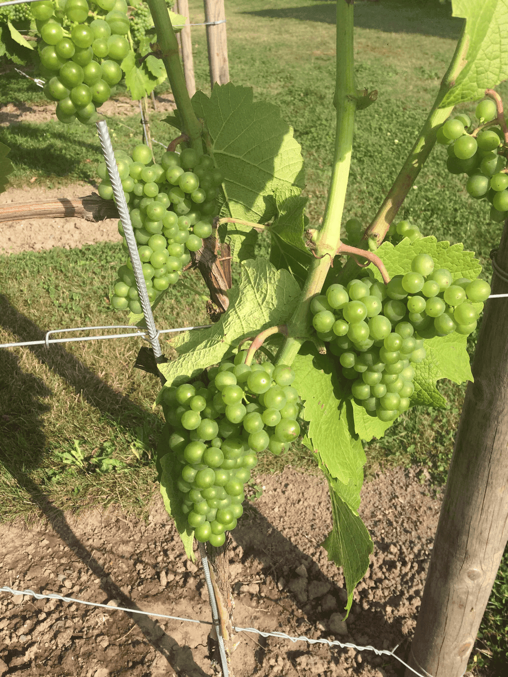 I slutet av juli och början av augusti avlövar vi runt klasarna för att skapa ventilation och att solens strålar kommer åt druvorna.